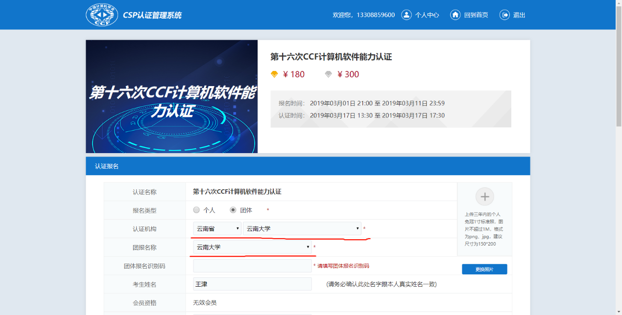 (2)报名(请注意:在”个人注册报名“中报名)。如下图所示,进入“认证报名”——》“认证考试报名”,在报名类型一项选择“团体”,并选择相应的团体名称(学校名称),将参团密码填写在“参团报名密码”一项中即可享受团体报名资格。(参见下图)