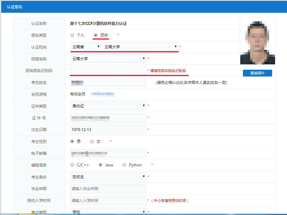 (2)报名。点击“认证报名”,进入报名页面,参见下图。报名类型选择“团体”,认证机构选择“OD体育官方网站”,团报名称选择“OD体育官方网站”,填写团体报名识别码,该识别码之后会单独通知,享受团体报名优惠资格。根据个人情况,填写其他信息,上传个人证件照片。