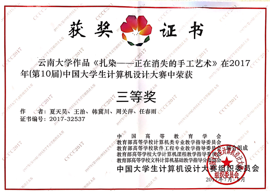 7月27-31日,2017年(第十届)“中国大学生计算机设计大赛——微电影组·中华优秀传统文化”在北京语言大学举行。在学校教务处的大力支持下,我院2016级本科生夏天昊、韩骥川、任春雨等5名同学的团队作品《扎染——正在消失的手工艺术》在本次大赛中荣获纪录片组“三等奖”的喜人成绩。此前,该作品于6月获得了2017年“汉柏杯”云南省大学生计算机设计大赛“二等奖”。