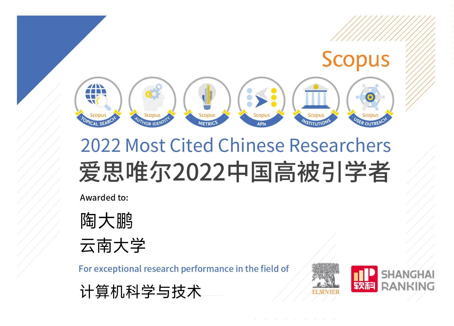 爱思唯尔高被引中国学者榜单是基于客观引用数据对中国研究者在世界范围内的影响力进行系统分析而得出的结果。陶大鹏教授长期致力于人工智能与机器人领域相关研究,2020至2022连续三年入选高被引学者榜单,是云南省计算机科学与技术学科领域唯一入选者,表明了陶大鹏教授以第一作者和通讯作者所发表论文的总引用次数在计算机科学与技术领域处于领先水平,具有较高的学术影响力。